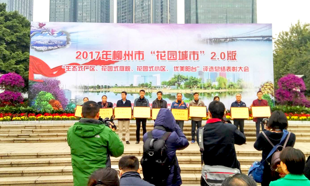 2017年12月27日,司能石油化工有限公司(以下簡(jiǎn)稱“司能石化”),經(jīng)柳州市陽(yáng)和規(guī)劃建設(shè)環(huán)保局、園林局等外部上級(jí)環(huán)保部門,以在柳州市人民廣場(chǎng)召開“2017年柳州市‘花園城市’2.0版——‘生態(tài)式廠區(qū)、花園式小區(qū)、優(yōu)美陽(yáng)臺(tái)’評(píng)選總結(jié)表彰大會(huì)”的方式,不僅授予了我司“生態(tài)式廠區(qū)”榮譽(yù)牌匾,還另外贈(zèng)送了“雙層三角梅、水紅三角梅、紫薇(花瓶式)、綠寶、粉花凌霄、炮仗花、龍吐珠”等價(jià)值約3000多元的名貴盆栽共計(jì)15盆,并對(duì)我司綠化工作人員的辛勤工作予以肯定。